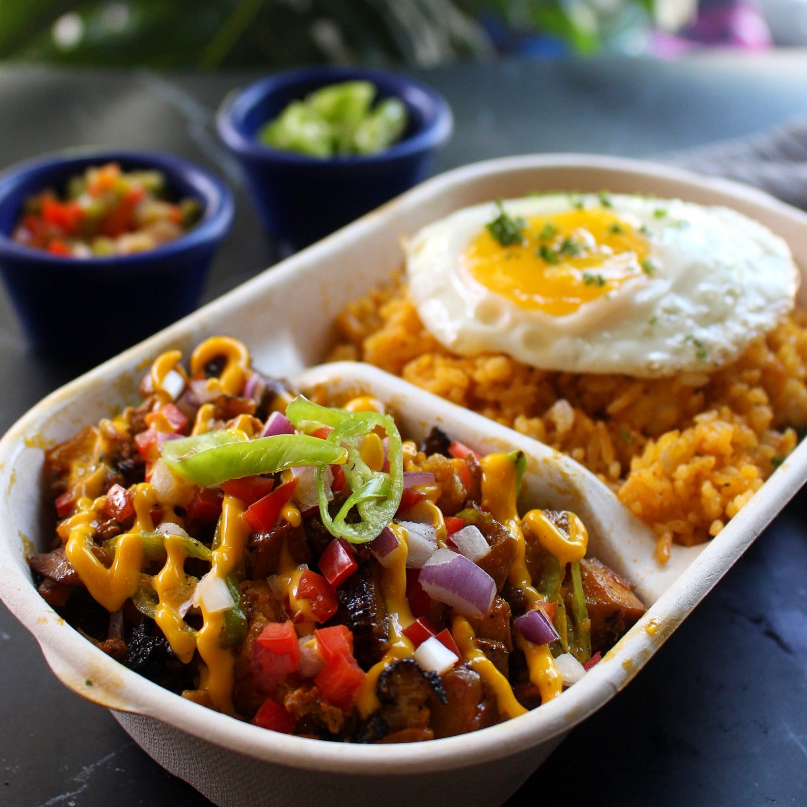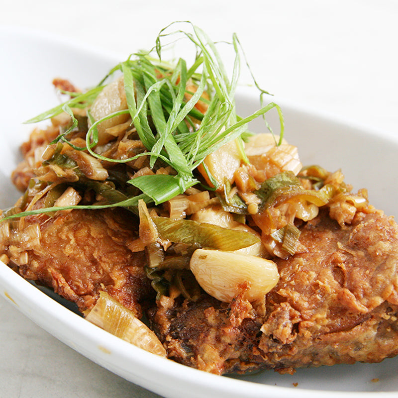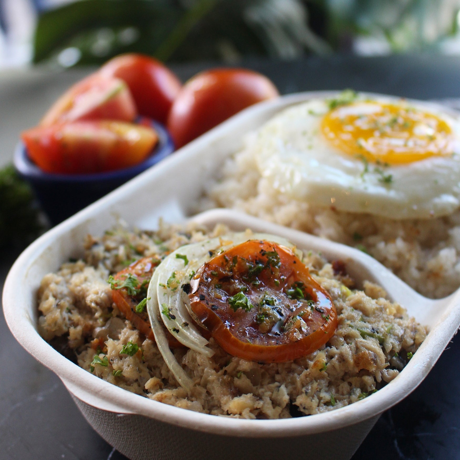 Bangus sisig, fried egg, grilled onions, and tomatoes served with garlic rice.
